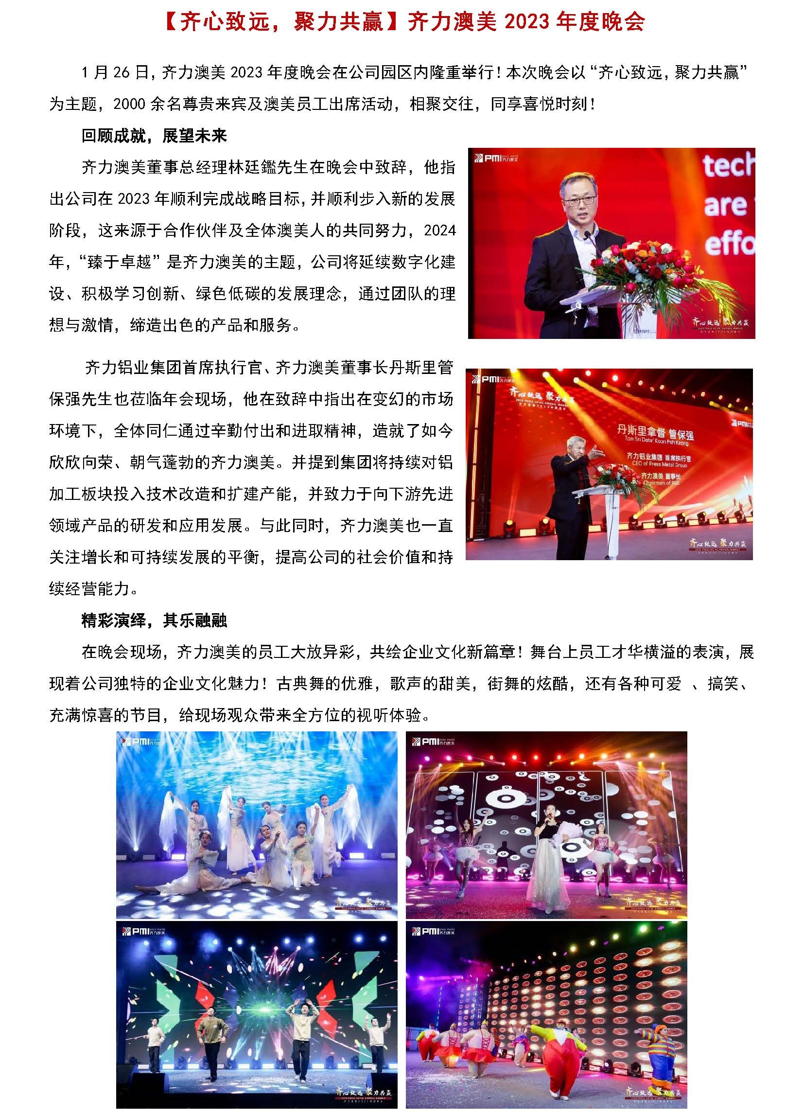2024. 03. 11齊力澳美,揚帆遠航!3月10日晚,齊力澳美2023年春茗晚會在佛山隆重舉行,齊力鋁業集團領導,合作伙伴以及齊力澳美全體員工悉數出席,見證公司全新篇章的華麗開啟。踔厲奮發·共譜新篇晚會的開篇通過視頻詮釋了齊力澳... -